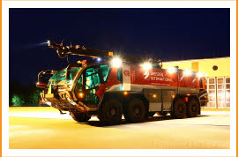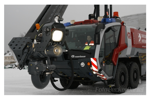 Flughafenfeuerwehr bei Flugzeugbränden. Der Panther CA-7 mit seinem Löscharm, ist